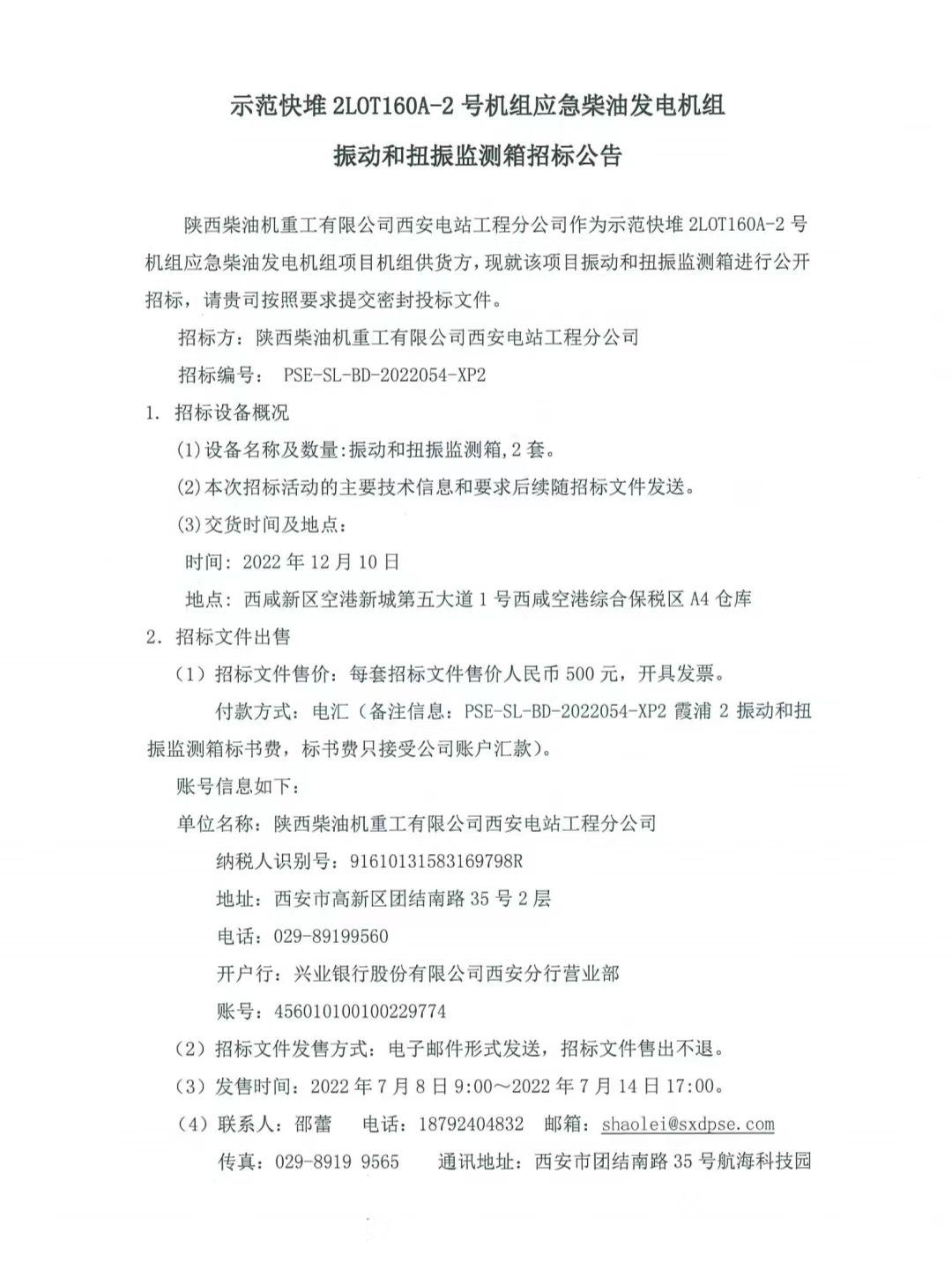 示范快堆2LOT160A-2號機組應急柴油發電機組振動和扭振監測箱招標公告