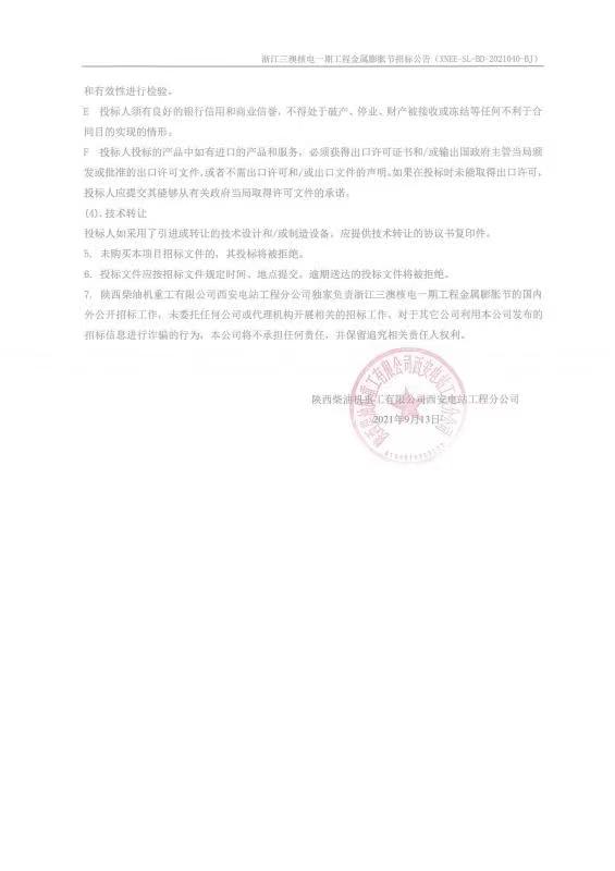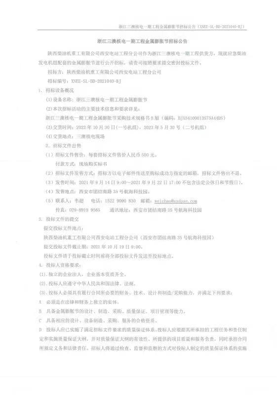 浙江三澳核電一期工程金屬膨脹節招標公告