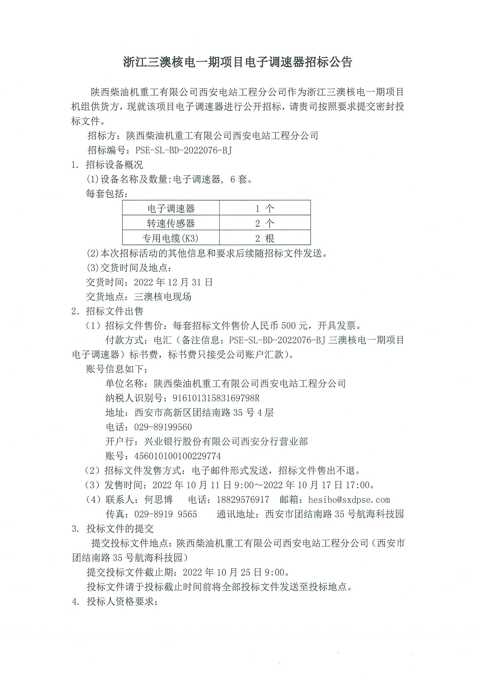 浙江三澳核電一期項目電子調速器招標公告