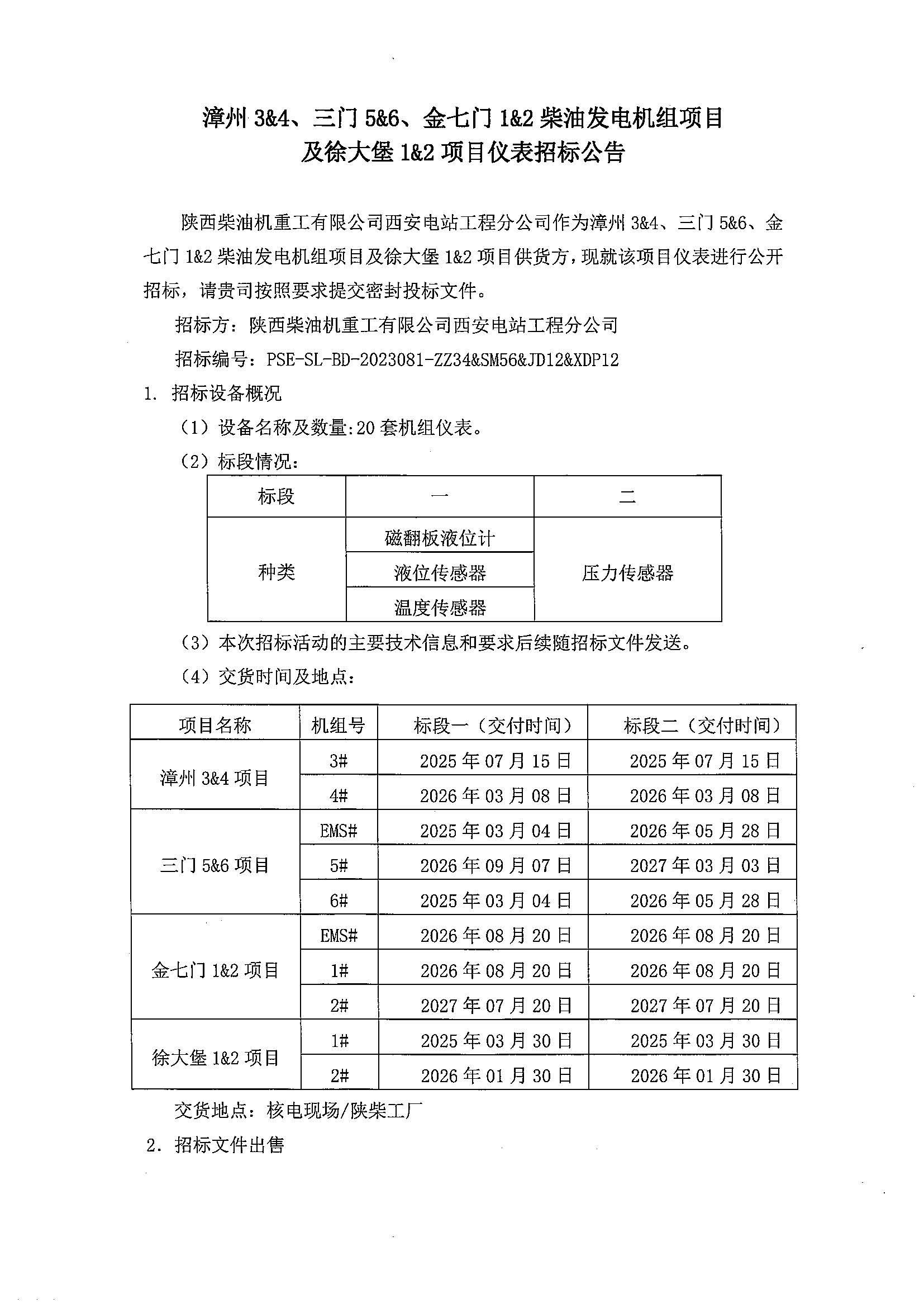 關于漳州34、三門56、金電12柴油發電機組項目及徐大堡12項目儀表招標公告