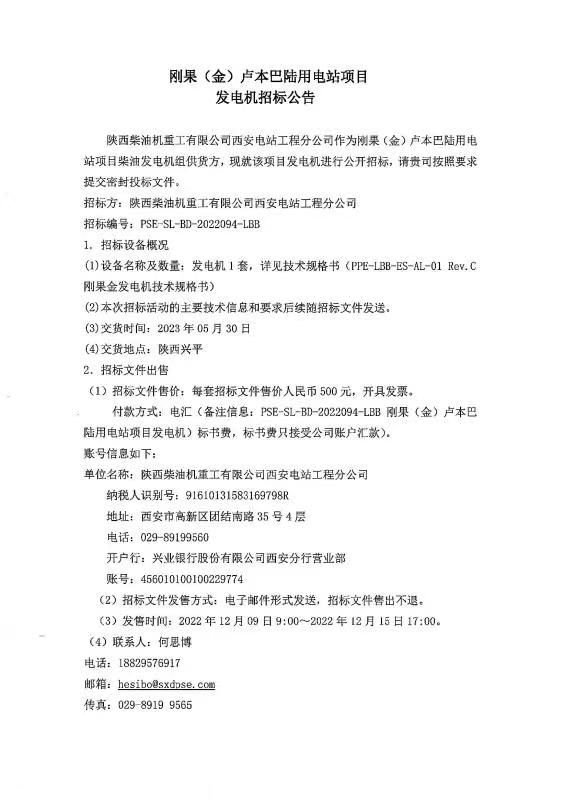 剛果(金)盧本巴陸用電站項目發電機招標公告