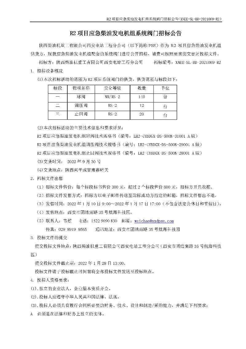 R2項目應急柴油發電機組系統閥門招標公告