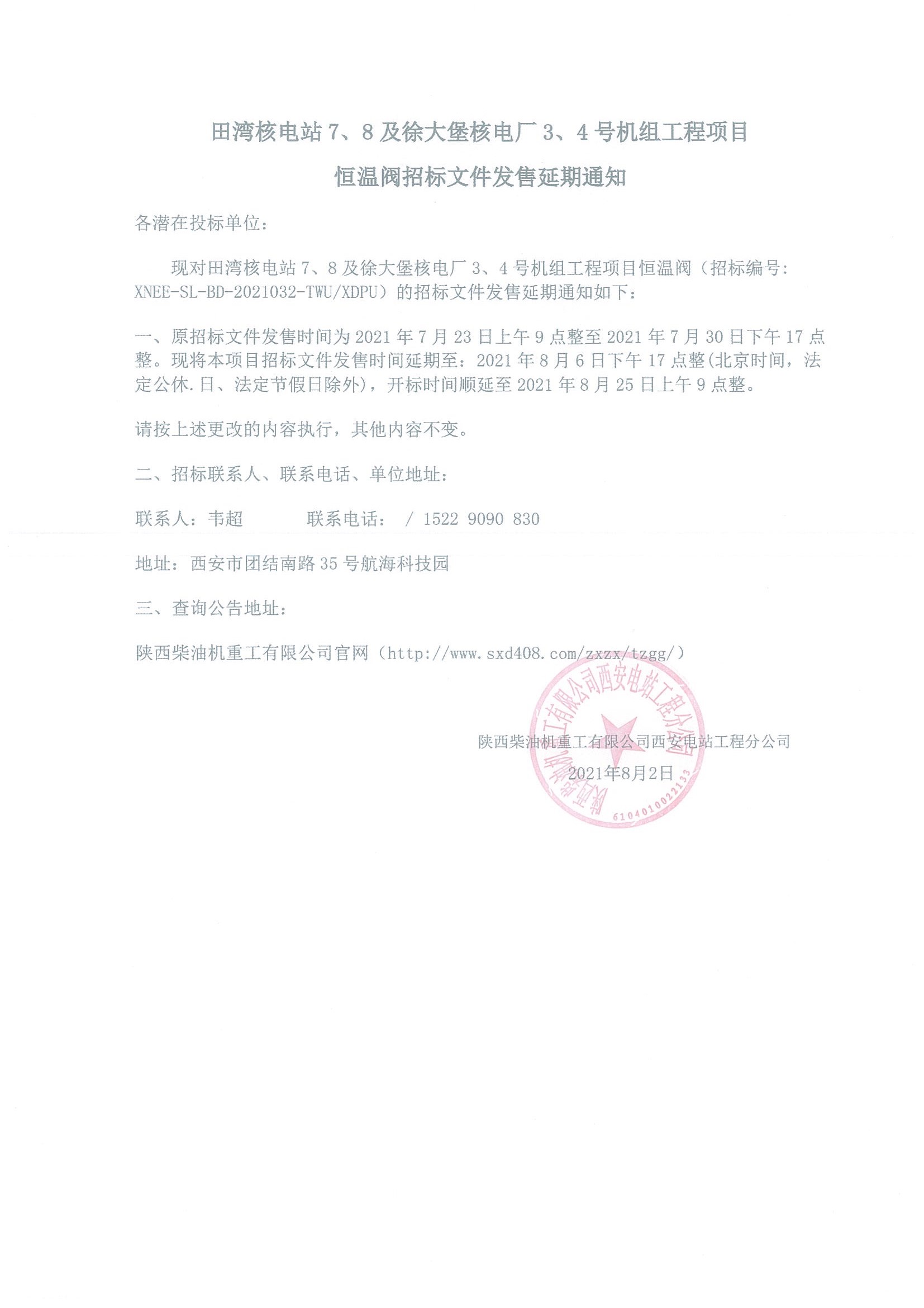 田灣核電站7、8及徐大堡核電廠3、4號機組工程項目恒溫閥招標文件發售延期通知